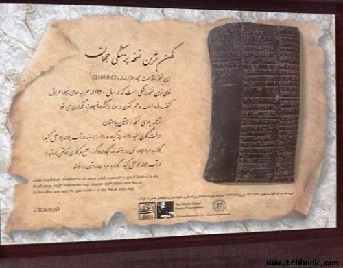 «این نسخه با قدمت چهار هزارساله، قدیمی ترین نسخه پزشکی است که در سال ۱۹۳۰ در خرابه های نیپور عراق کشف شده است و هم اکنون در موزه دانشگاه پنسیلوانیا آمریکا نگه داری می شود.»